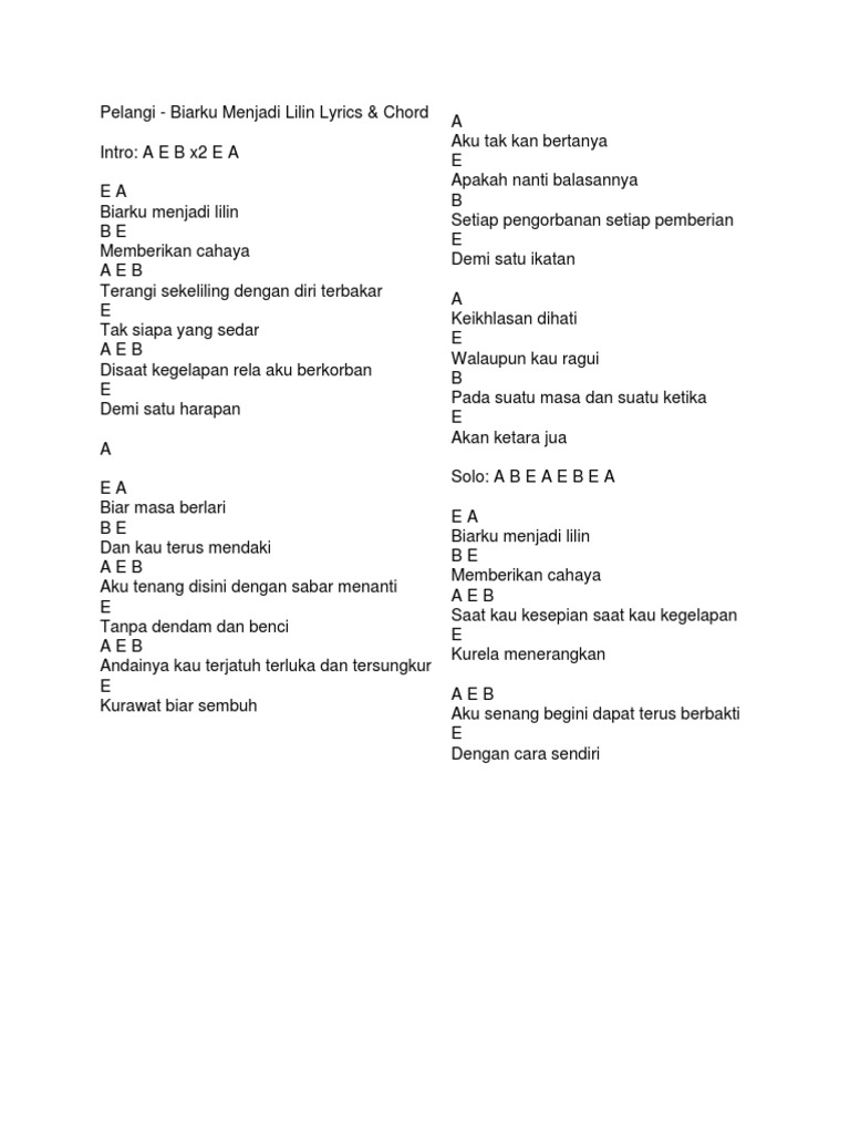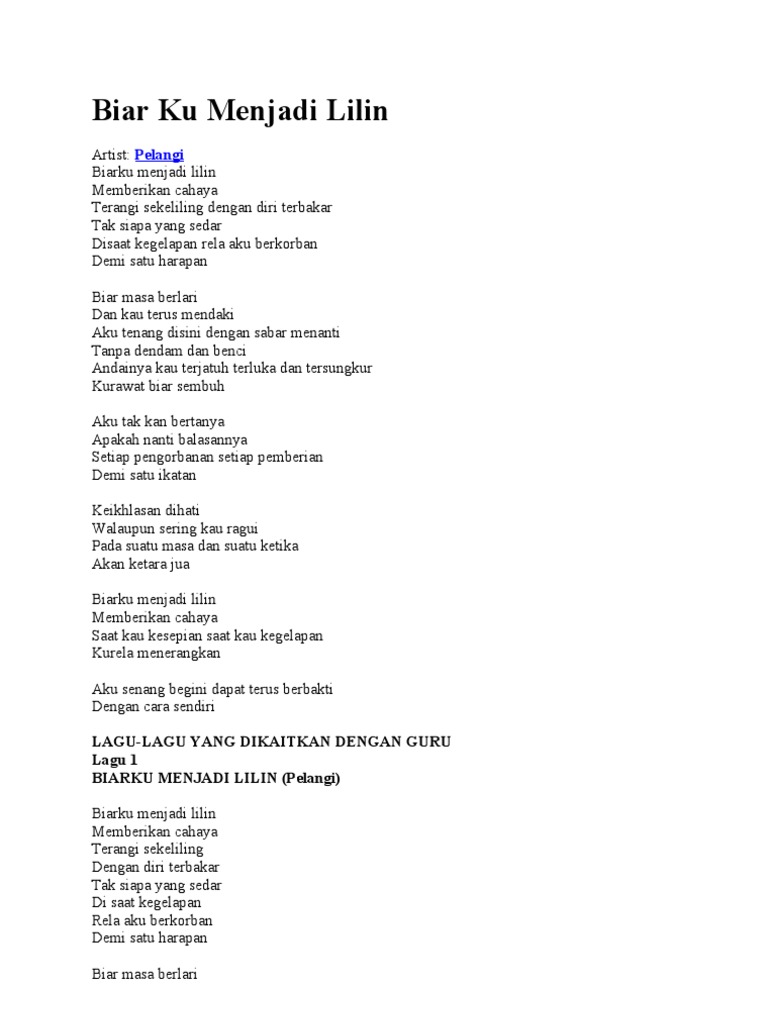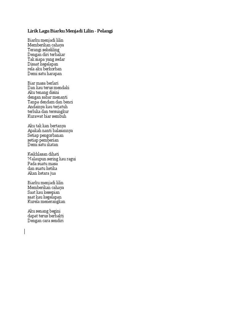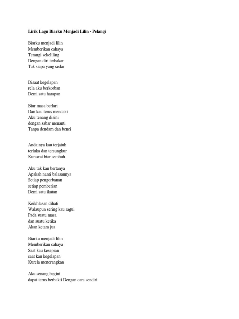 Pelangi telah mengeluarkan 5 studio album iaitu Kisah Baba Dan Nyo. Web Lirik Suatu Masa - Lirik Lagu Biarku Menjadi Lilin Pdf. Lirik Lagu Biarku Menjadi Lilin - Pelangi.